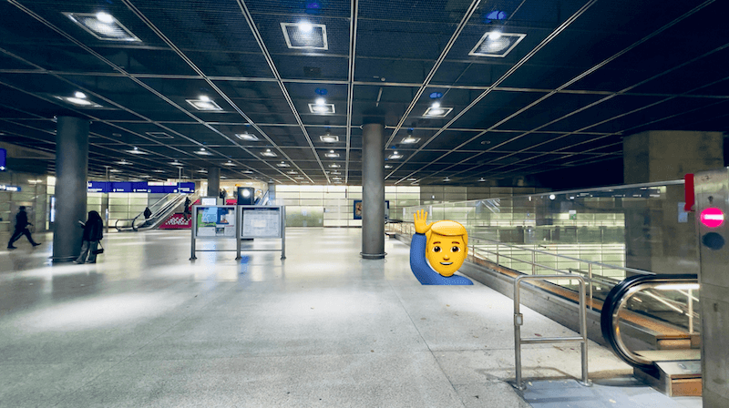 There is an open area on the upper level between train tracks 1-2 and 3-4, next to the large information boards and central pillar, just before the escalators down to the platforms.